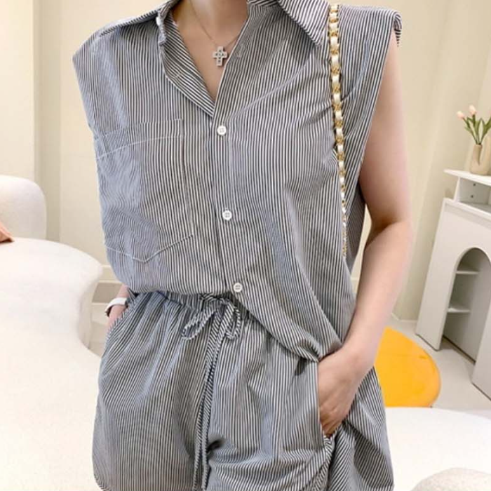 캐주얼한 줄무늬 패턴 코디셋업 슬리브리스 상하세트