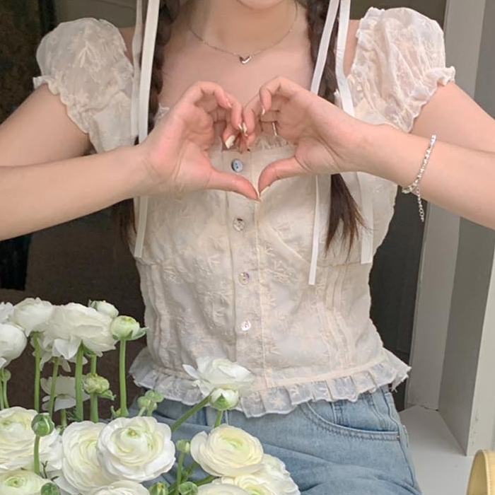 레이스 디테일 블라우스 섬세한 러블리 여성 반팔티