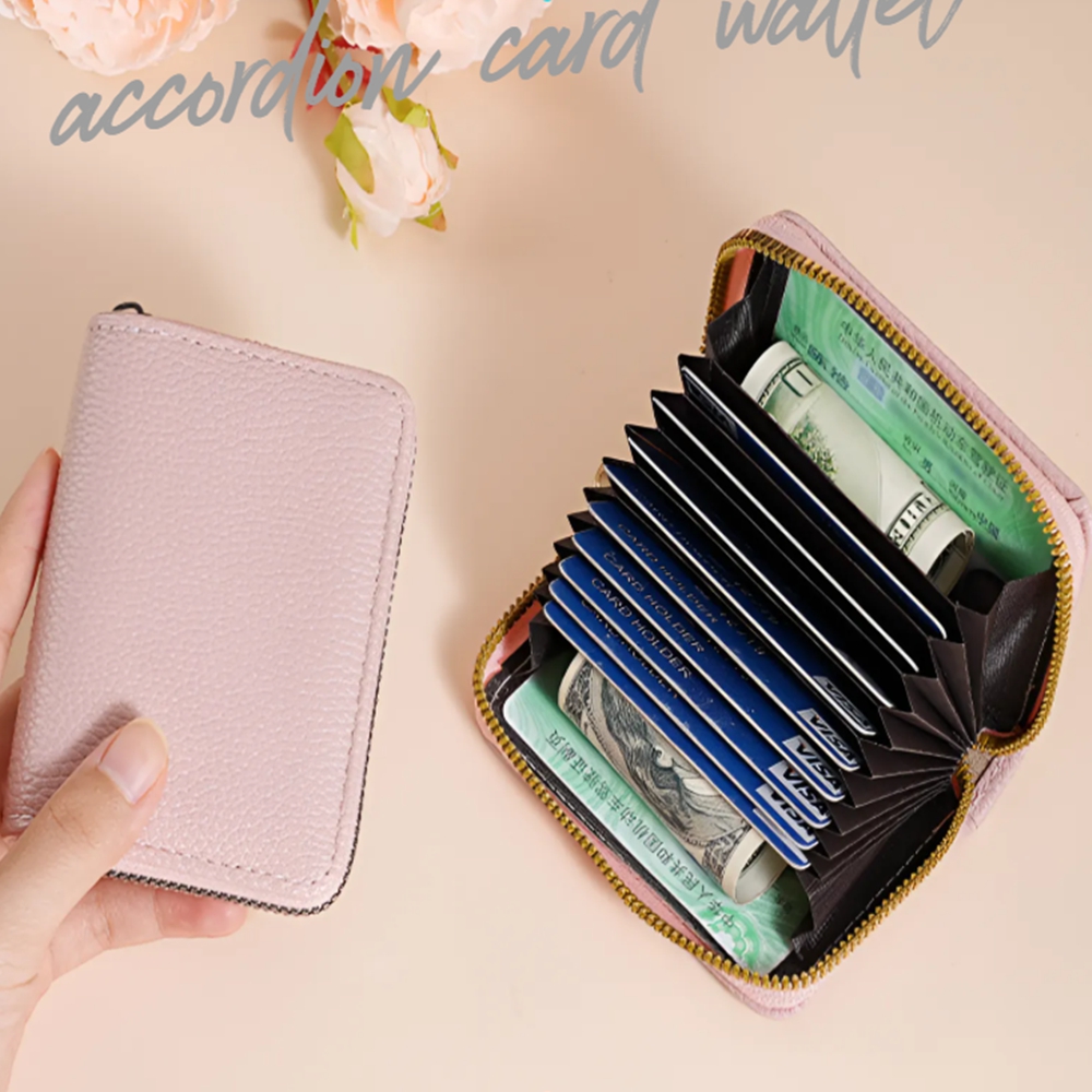 여성 아코디언 카드지갑 12슬롯 소가죽 미니 지퍼 지갑 명함 카드홀더