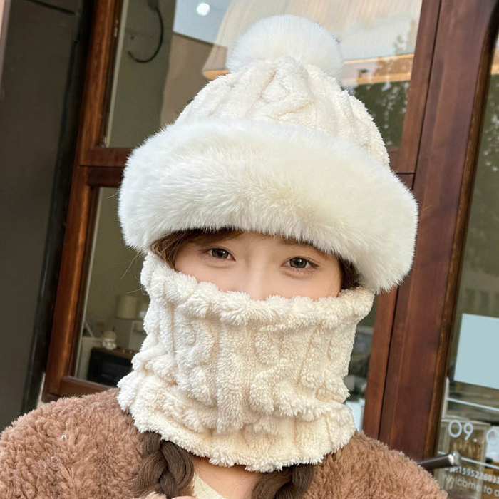 풍성한 퍼 모자 넥워머 일체형 햇 트위스트 디자인