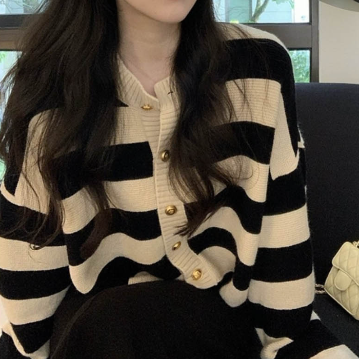 트렌디한 골드버튼 포근한 가디건 굵은 줄무늬 카디건