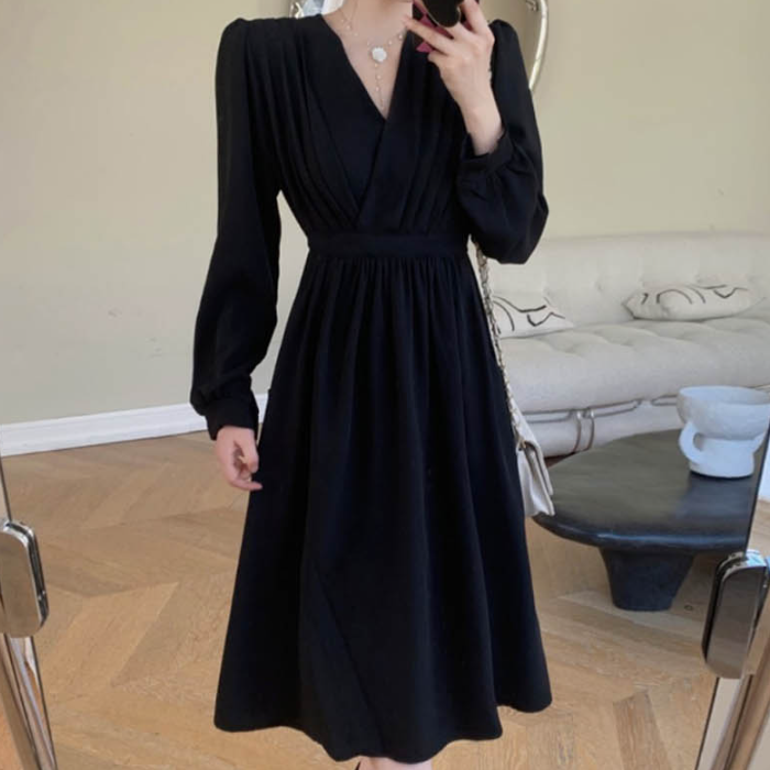 우아하고 세련된 브이넥 플리츠원피스 A라인 드레스