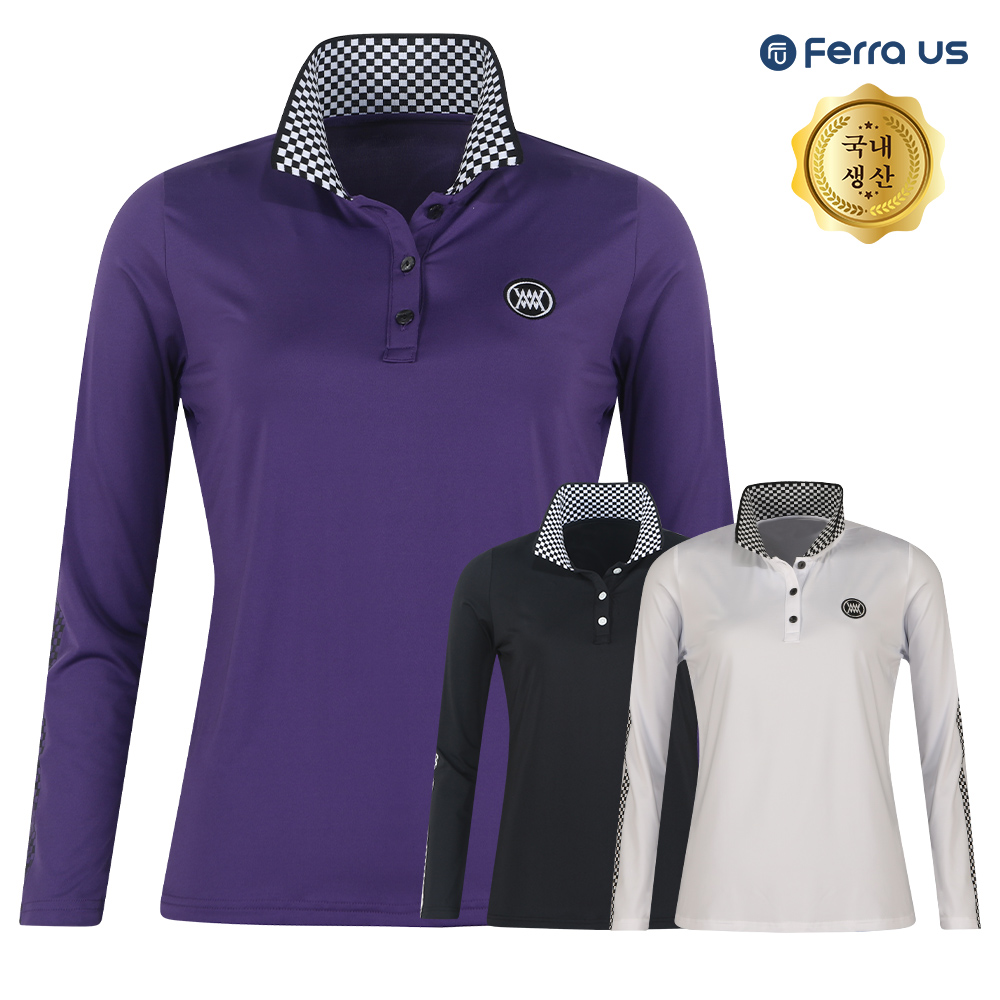 - 페라어스 여성 국산 체크카라 기능성 슬림핏 골프티셔츠 ATF5MI5566