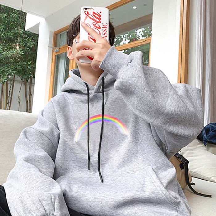 - 베이직핏 기모 후드티 소매 시보리 무지개 프린팅