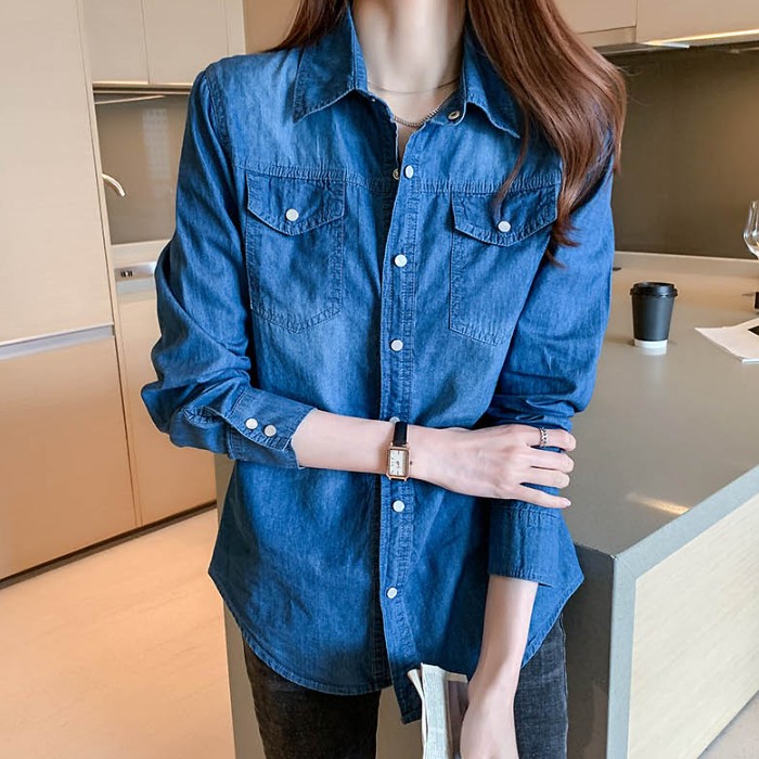 - 데님 남방 단정한 여성 카라 셔츠 내츄럴한 레이어드룩