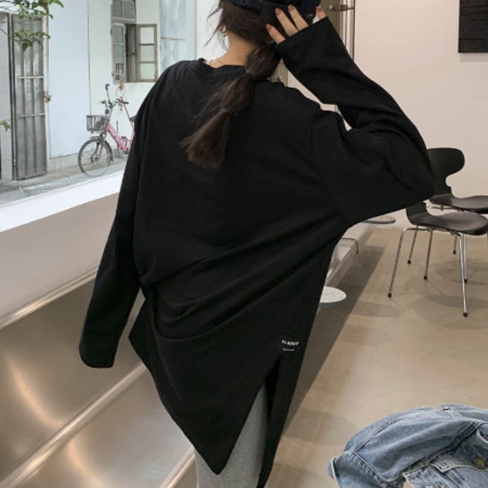 - 절개 긴팔티 멋스러운 사이드 디테일 무지 디자인 티셔츠