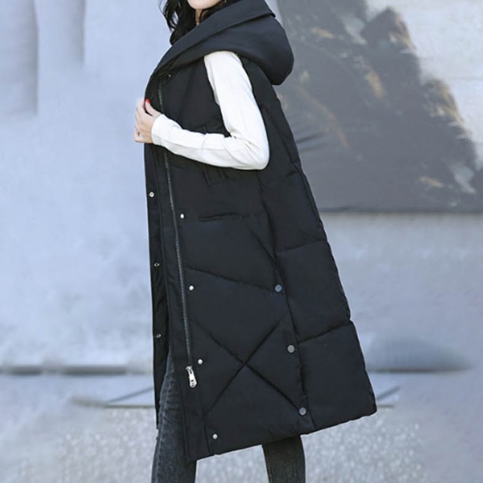 - 길어보이는 롱 격자 여성 점퍼 후드 달린 패딩 조끼