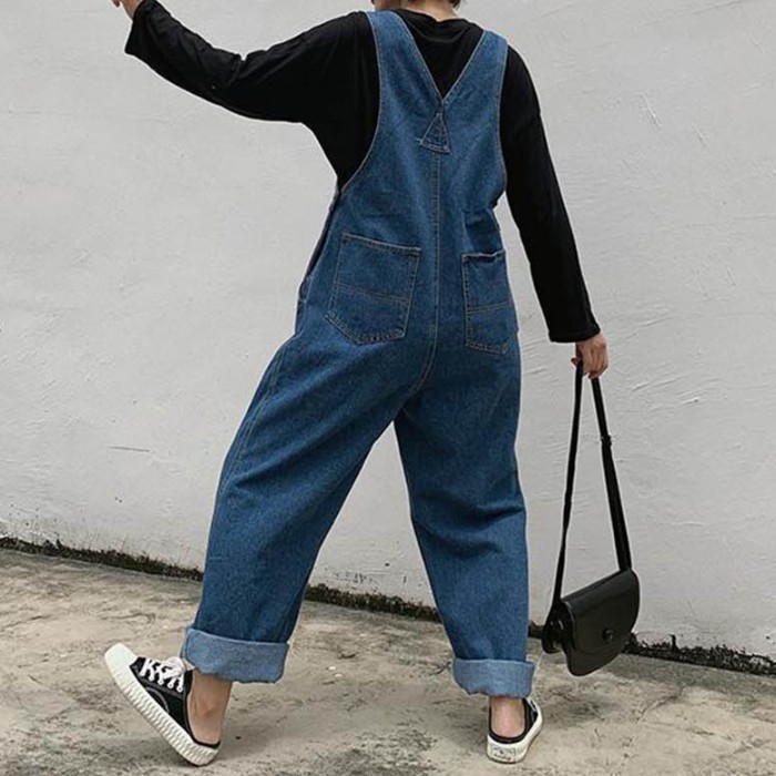- 여성 멜빵 와이드핏 데님 점프수트 트렌디한 스타일