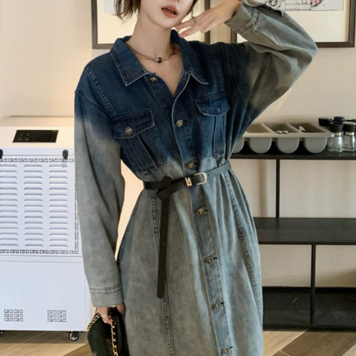 - 셔츠형 드레스 투톤 워싱 벨트 포함 빈티지 데님 원피스