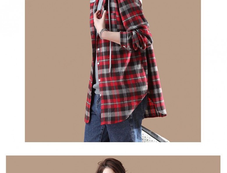 - F788520 레드 체크 얇은 모직 후드 셔츠 남방 아우터
