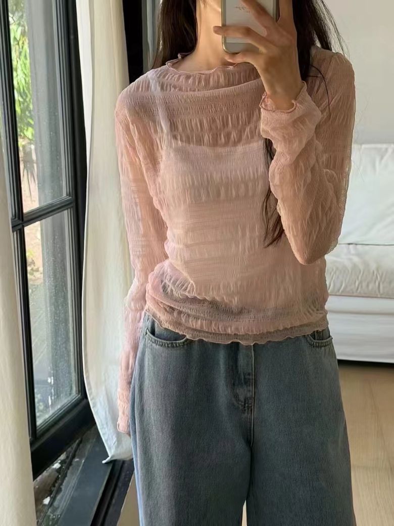 - F11543 레이스 시스루 주름 슬림 망사 블라우스 티