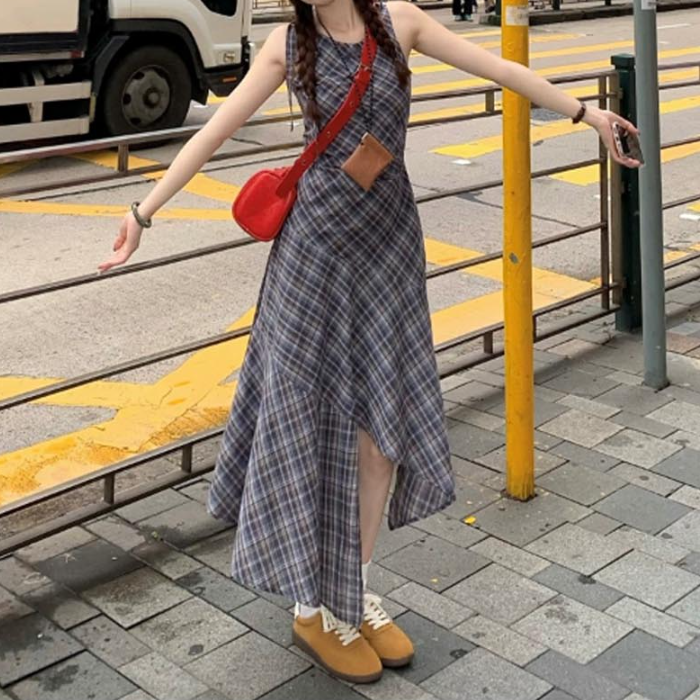 - 우아한 원피스 언밸런스한 플레어 라인 체크 치마