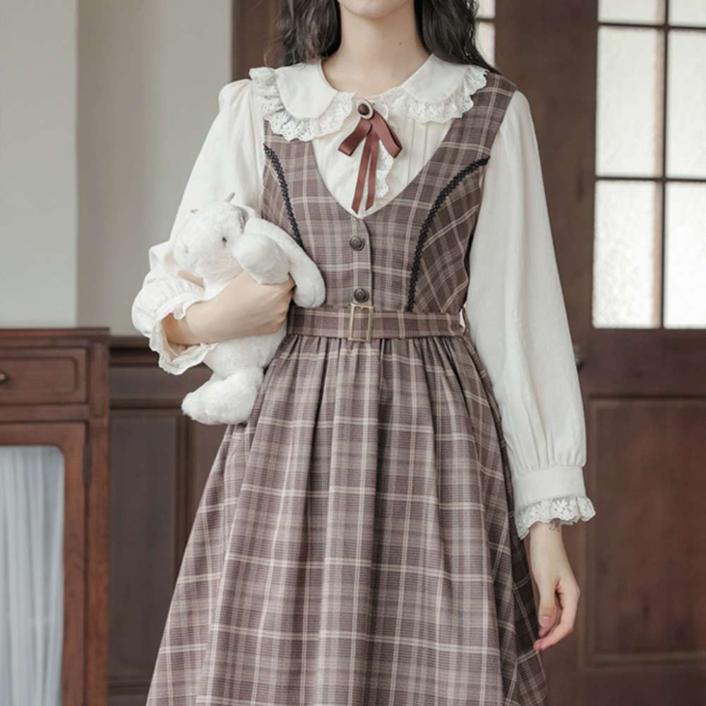 - 브라운체크 레이스 버클 프렌치 레트로 경성의상 긴팔.