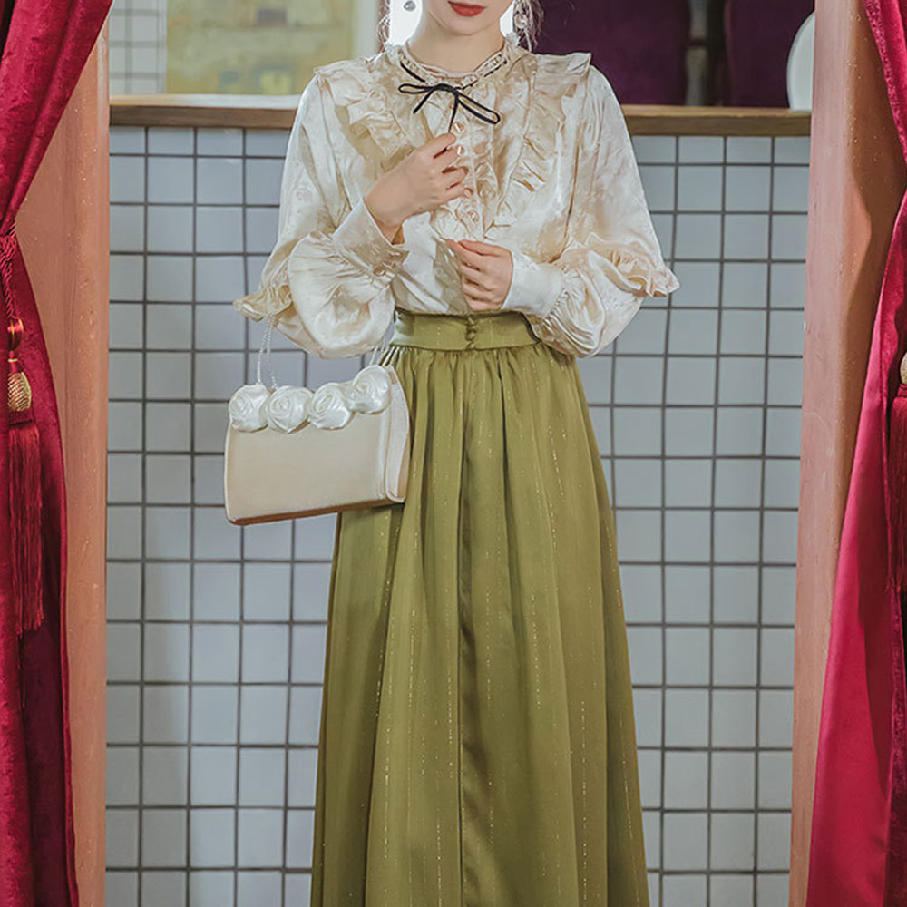- 소프트 레이스 긴팔 블라우스 그린 트임 롱스커트세트.