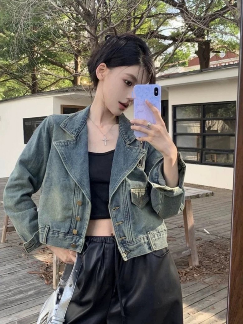 - F942270 벨트 빈티지 워싱 짧은 청 데님 재킷 아우터