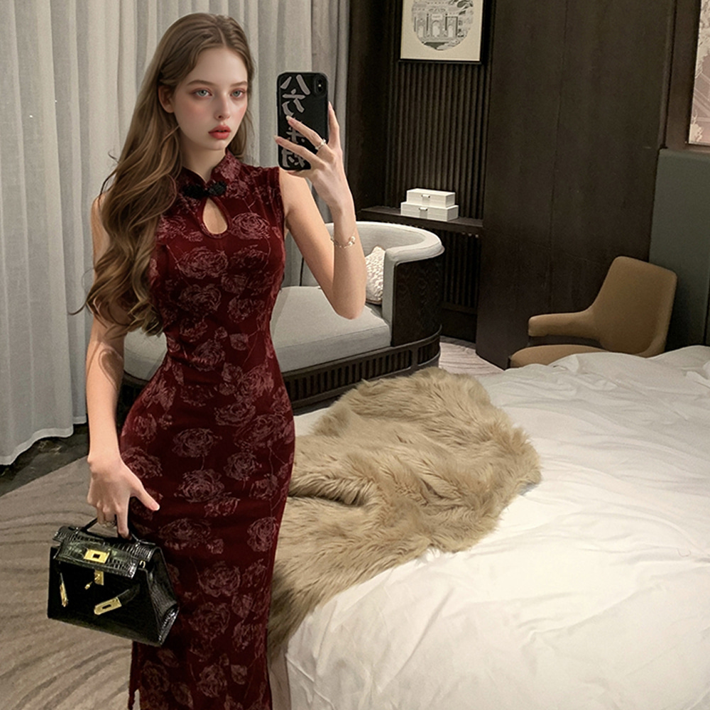 - (대여) 레드 로즈패턴 키홀 벨벳 치파오 원피스 교복.