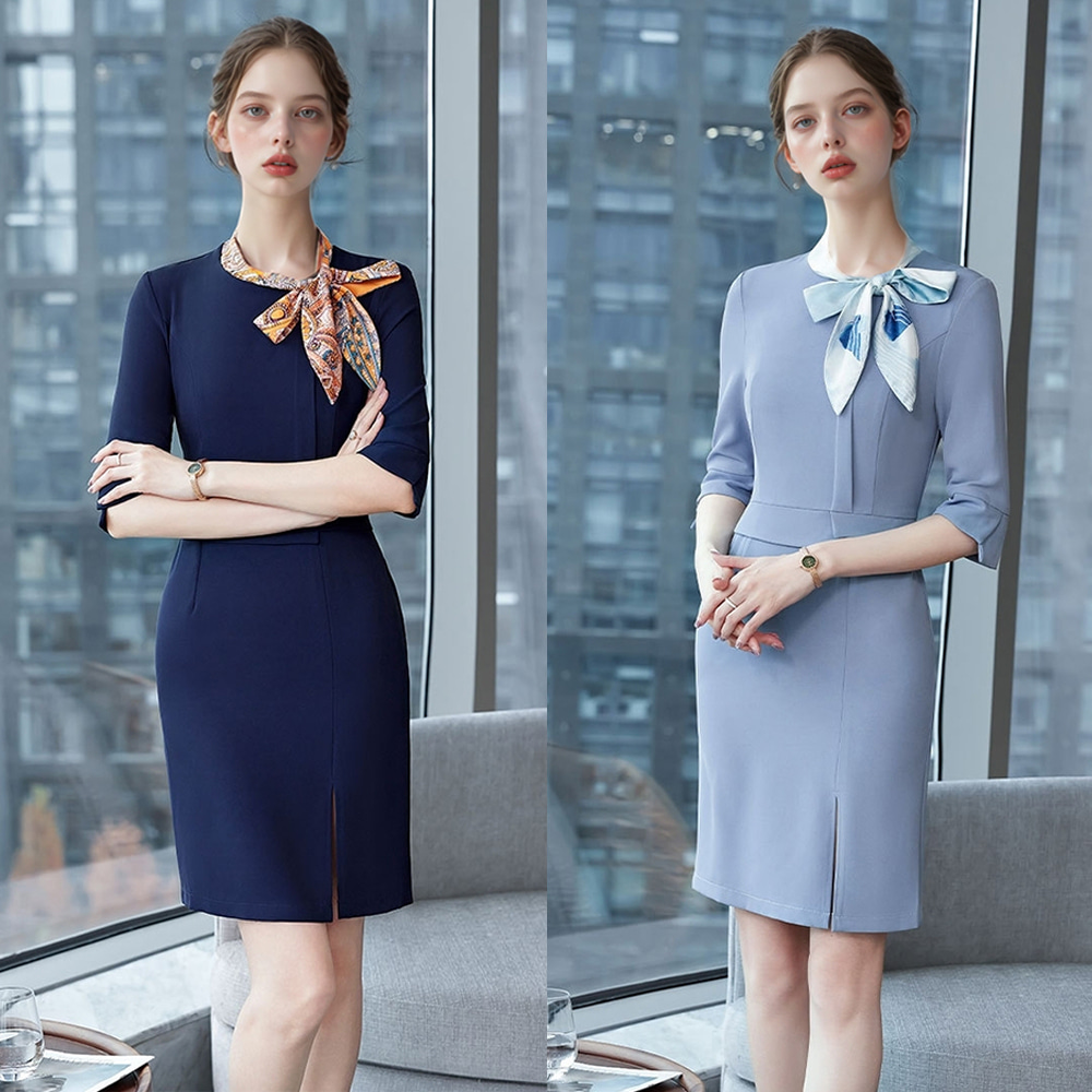 - 오피스 리셉션 패턴 스카프 슬림핏 H라인 원피스.
