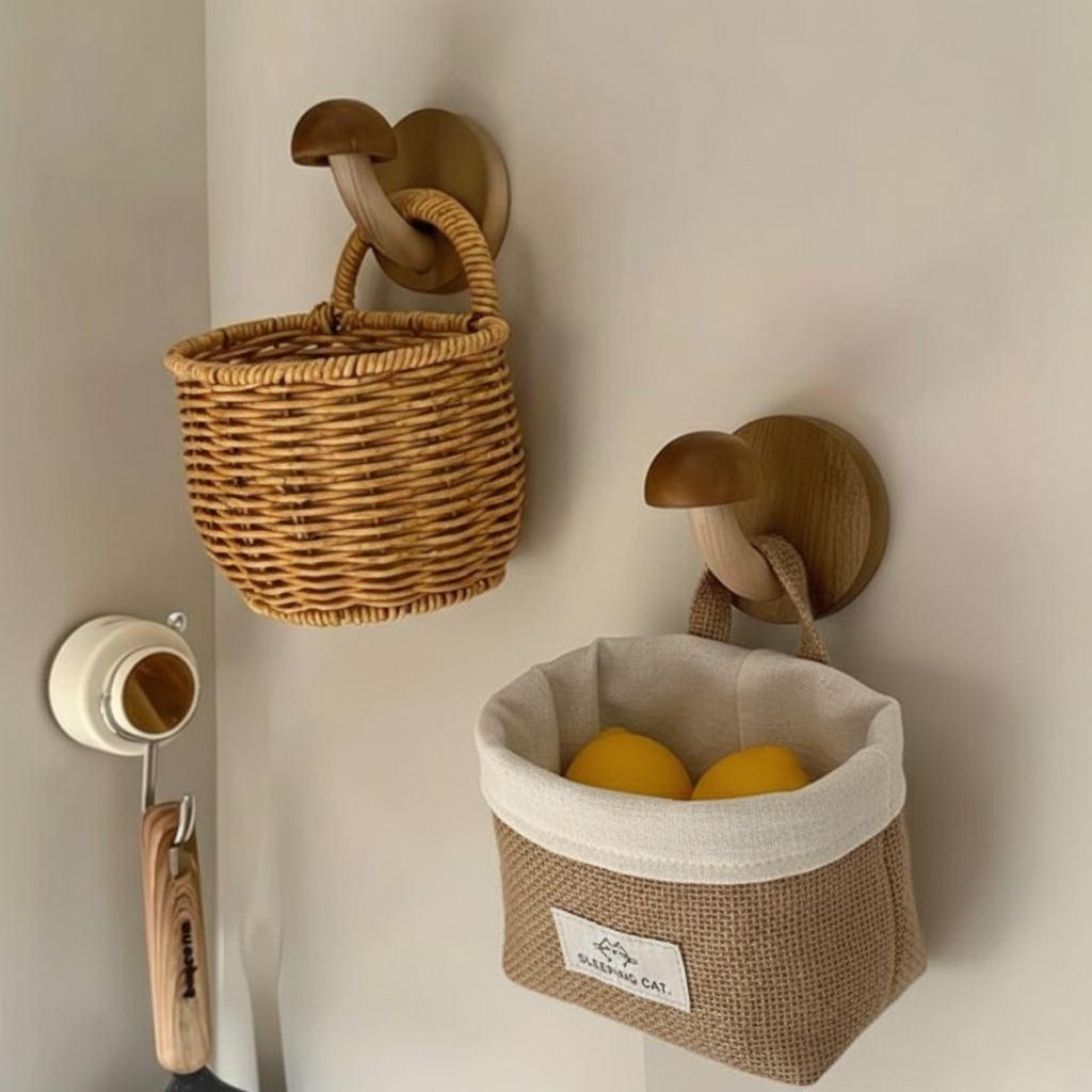 - [무타공/후크+바구니세트] 감성 머쉬룸 우드 후크 무타공 현관 걸이