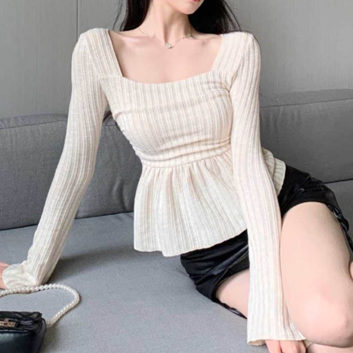 골지디자인 여성 티셔츠 볼륨 스퀘어넥 긴팔티
