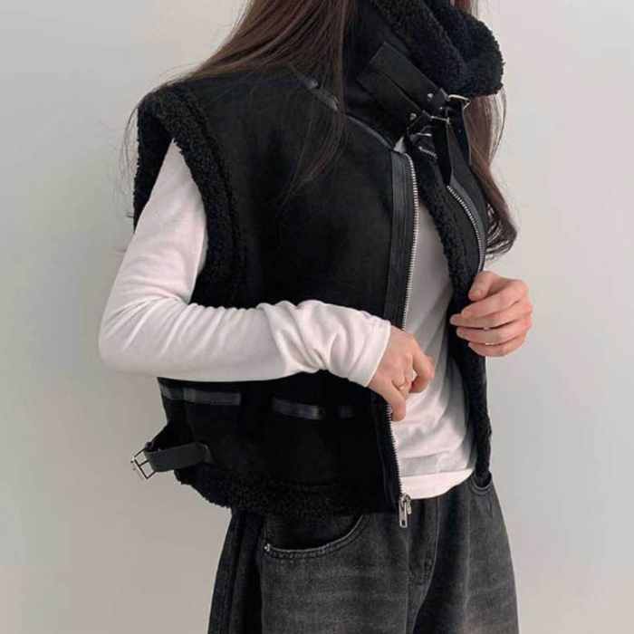 빈티지한 감성 하이넥 버클 조끼 무스탕 베스트