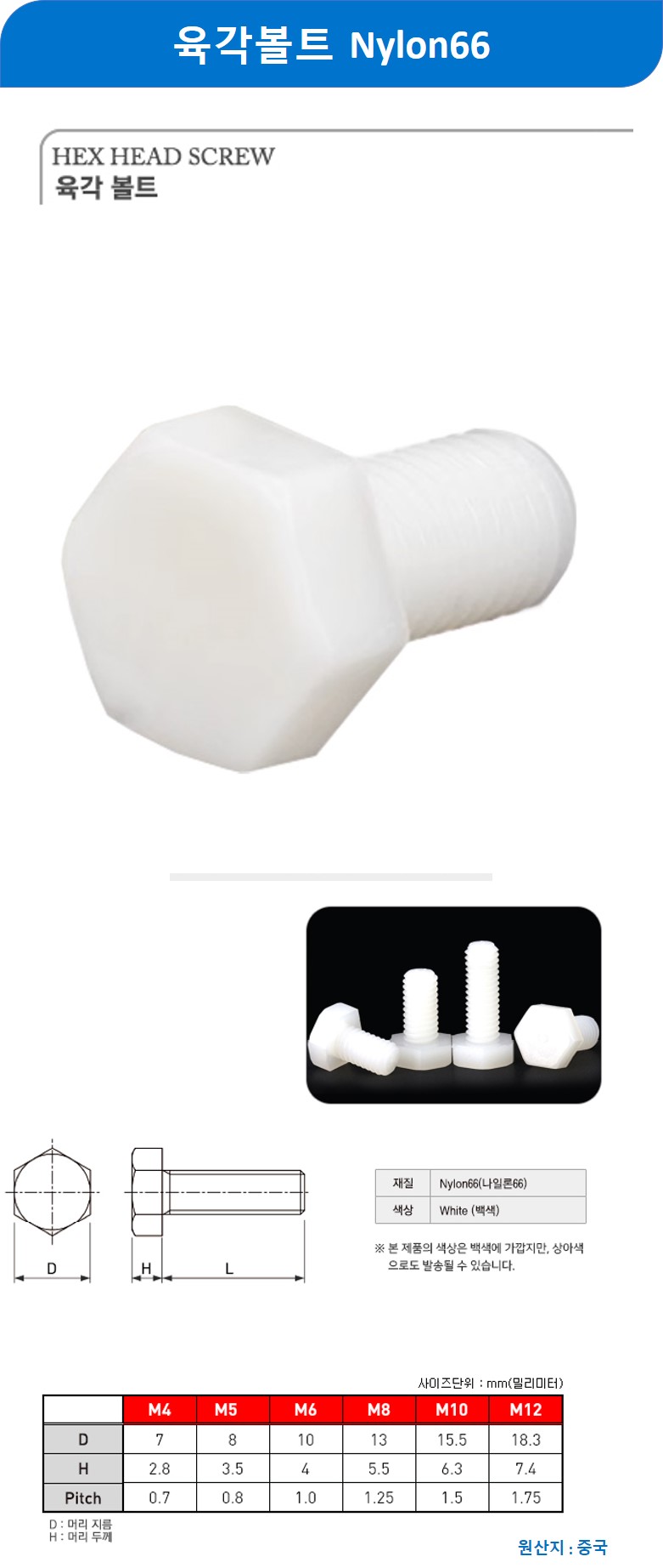 육각볼트 Nylon66백색 M12x20mm 150개