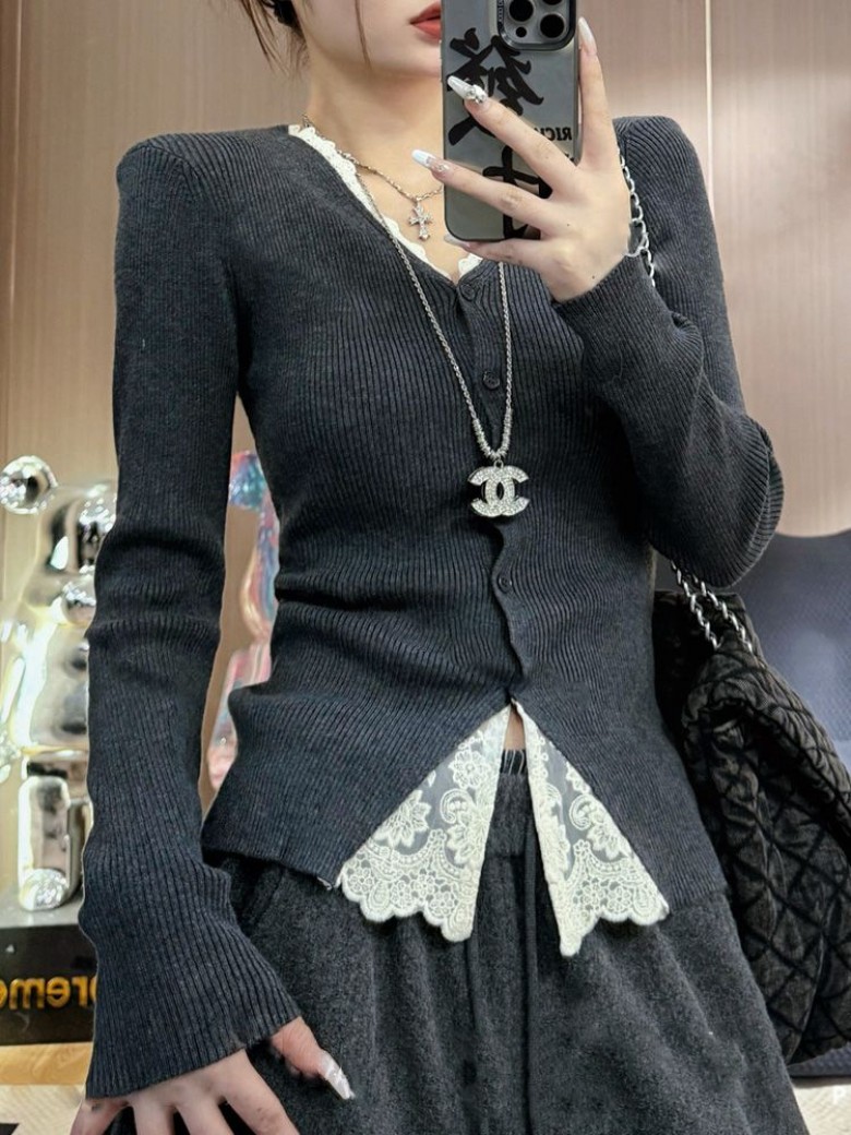 F947731 레이스 포인트 슬림 여리 소녀 v넥 니트 티