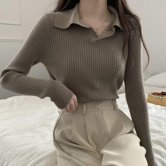 골지 짜임 세련된 티셔츠 카라 롱슬리브 브이 넥트임