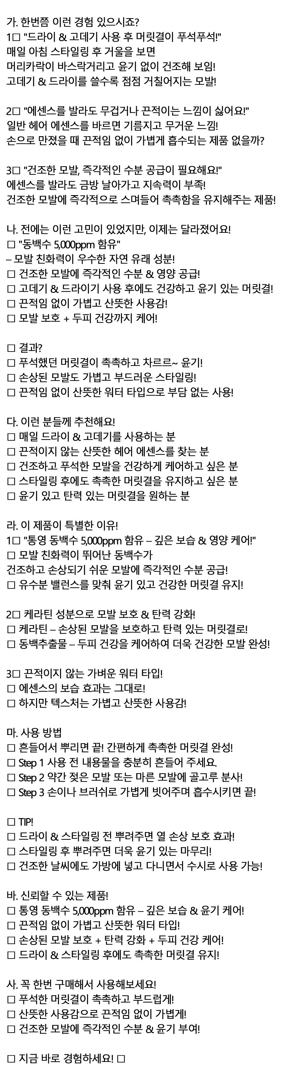 만졌을때 끈적임없이 흡수 동백 헤어 에센스 300ml