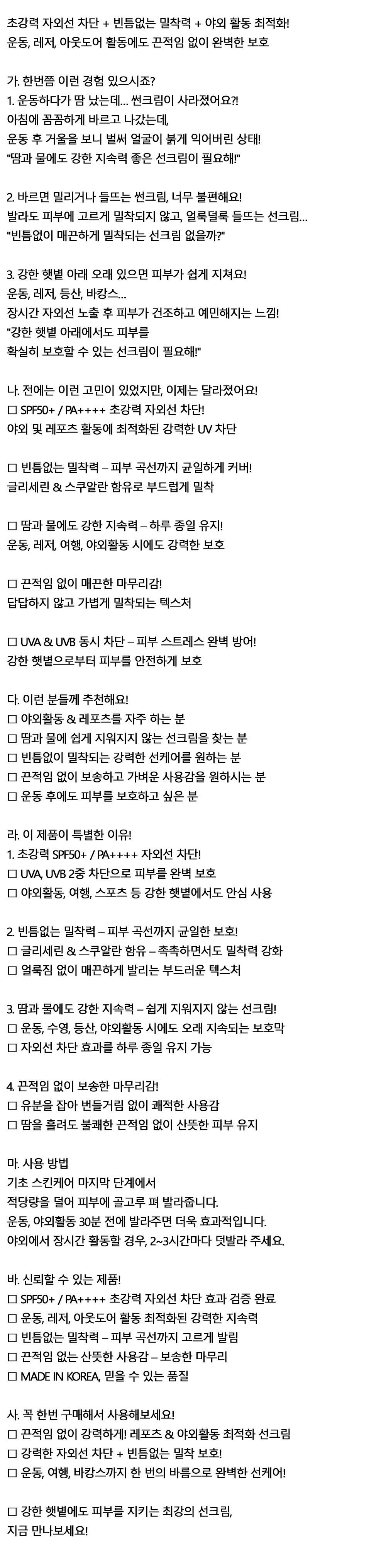 운동 레저 아웃도어 활동에도 끈적임없이 선크림 70g