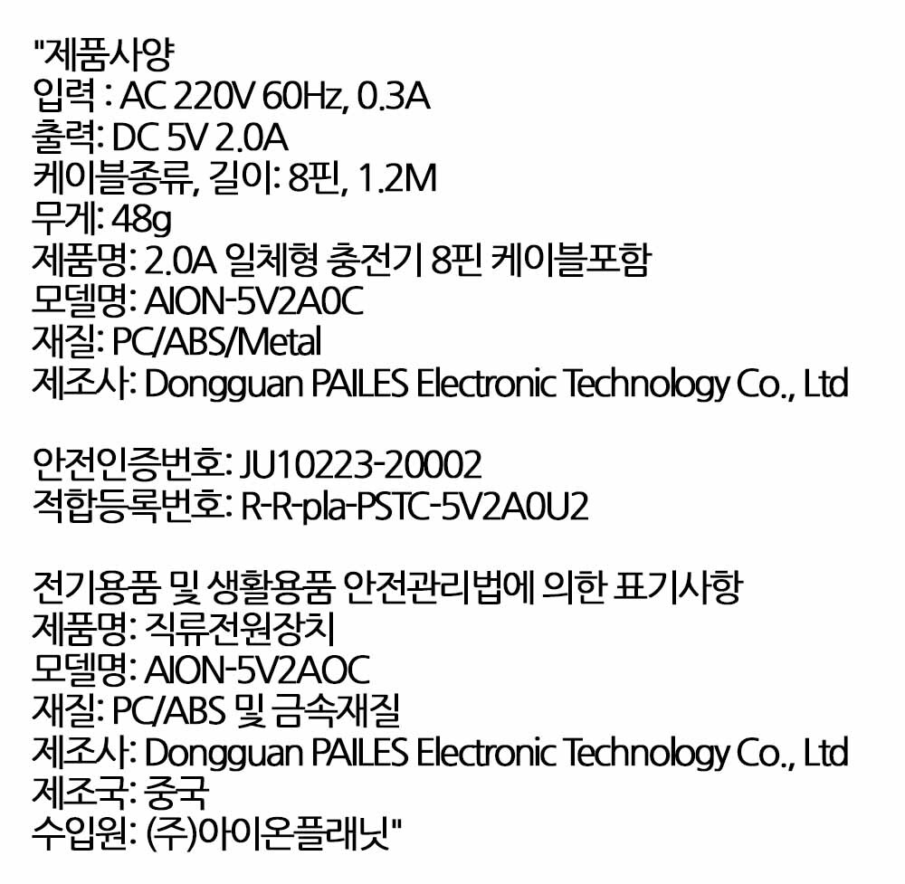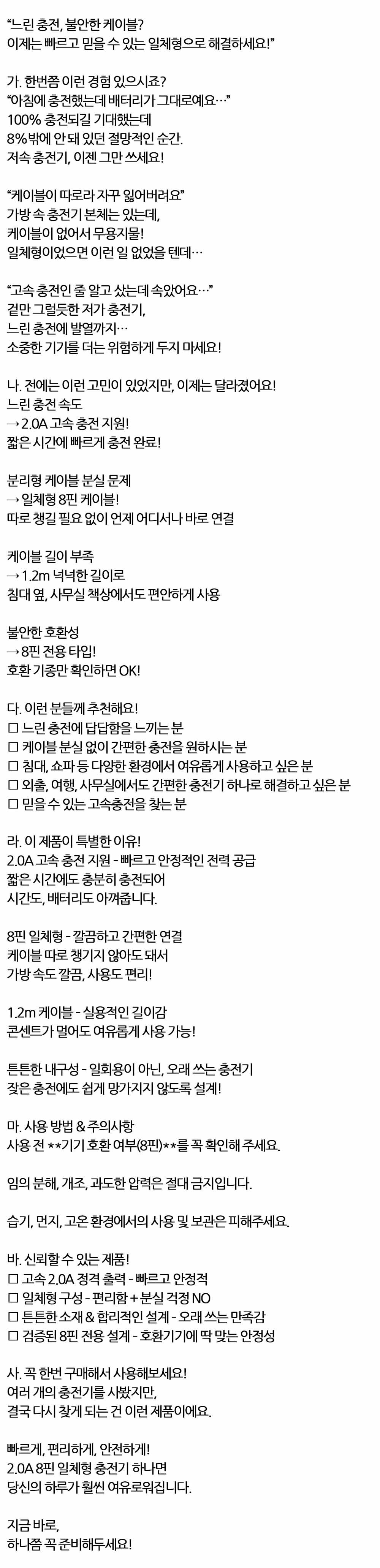 빠르게 편리하게 안전하게 일체형 충전기 2.0A 8핀