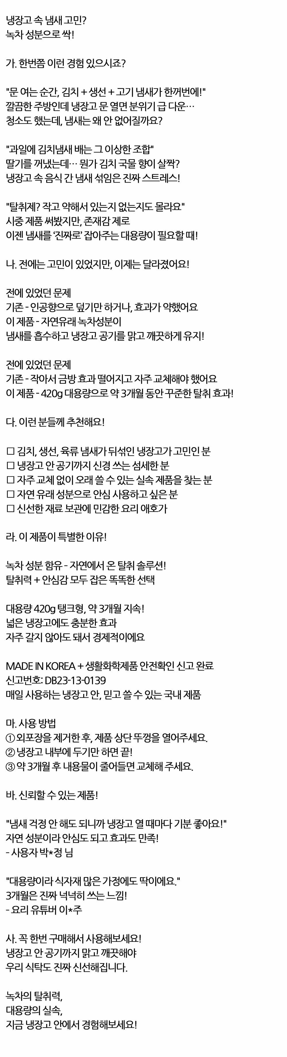 냉장고 속 냄새 고민 녹차 성분으로 싹 탈취제 420g