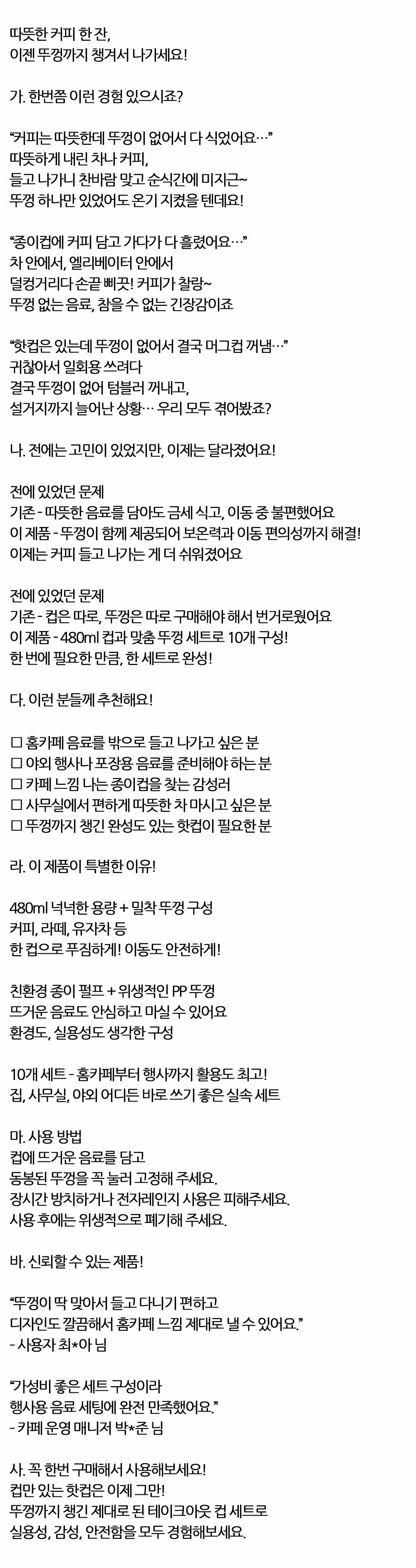 따뜻한 커피 한 잔 일회용 종이컵 뚜껑세트 480ml 10P