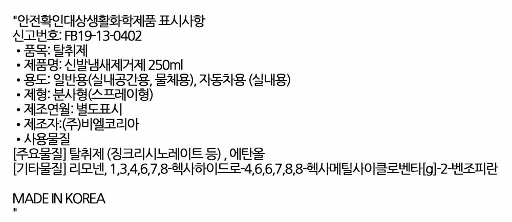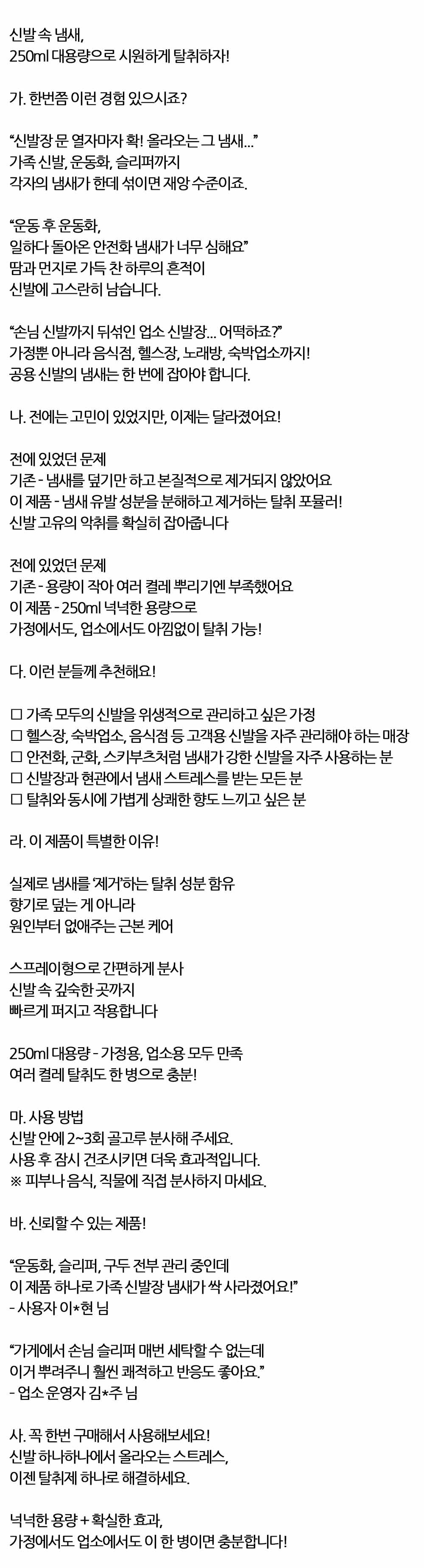 고유의 악취 확실히 잡아줍니다 신발냄새제거제 250ml