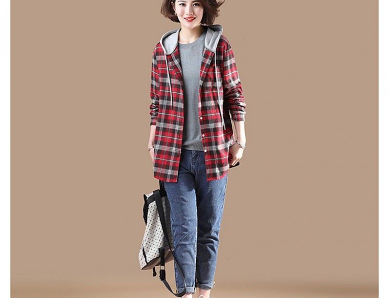 F788520 레드 체크 얇은 모직 후드 셔츠 남방 아우터