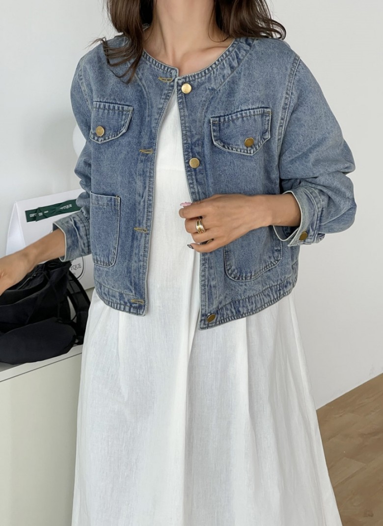 F51310 노카라 라운드 심플 청 데님 재킷 아우터