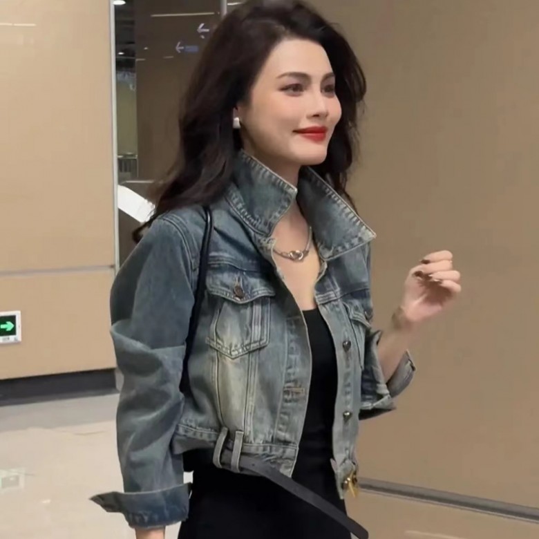 F942270 벨트 빈티지 워싱 짧은 청 데님 재킷 아우터