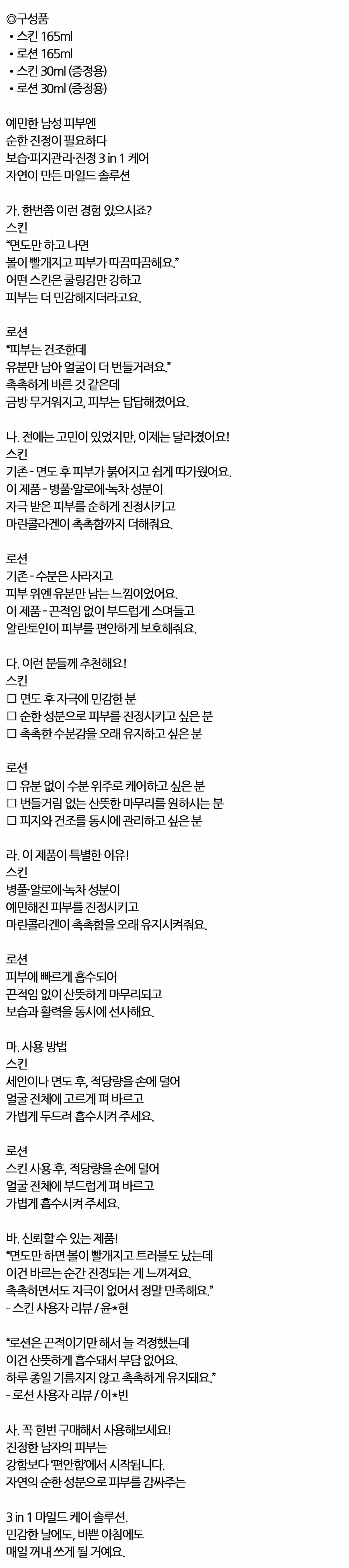 예민한 피부엔 순한 진정이 필요합니다 남성 2종세트