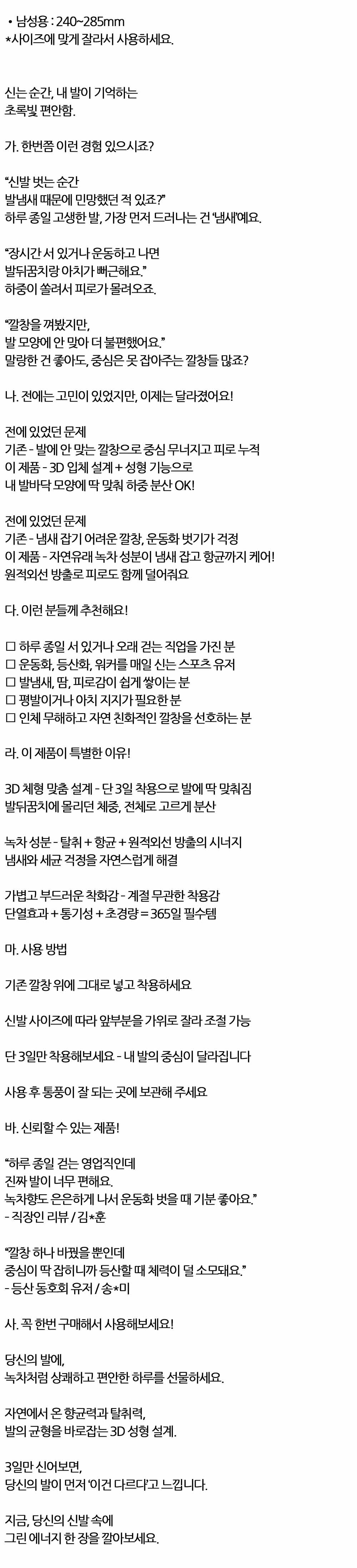 신는 순간 내 발이 기억하는 초록빛 남성용 신발깔창
