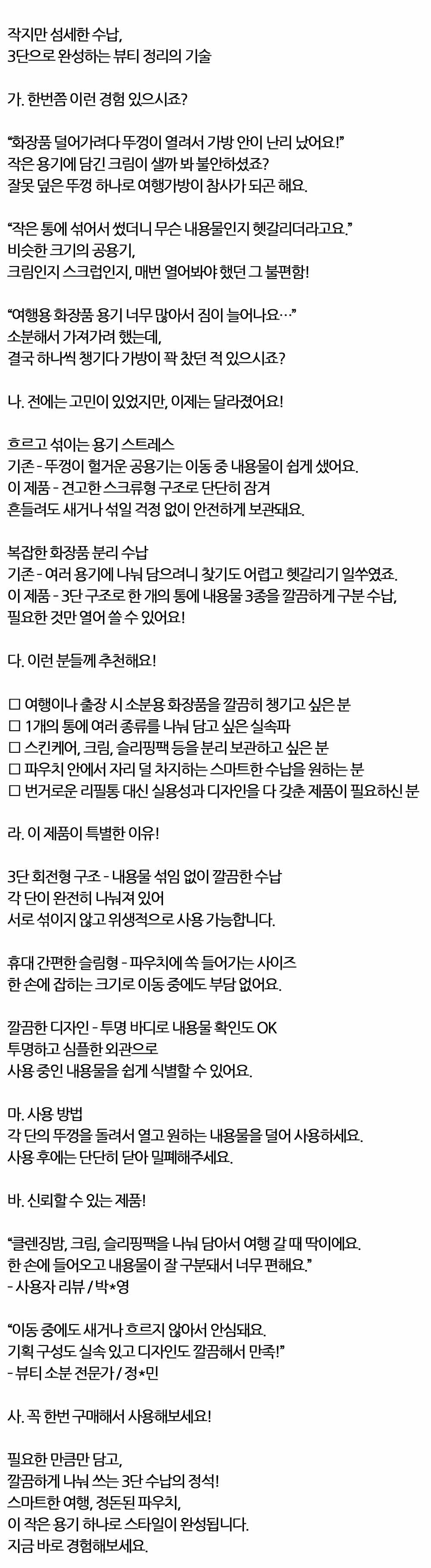 여행 출장시 내용물 깔끔하게 구분 수납 3단 크림용기