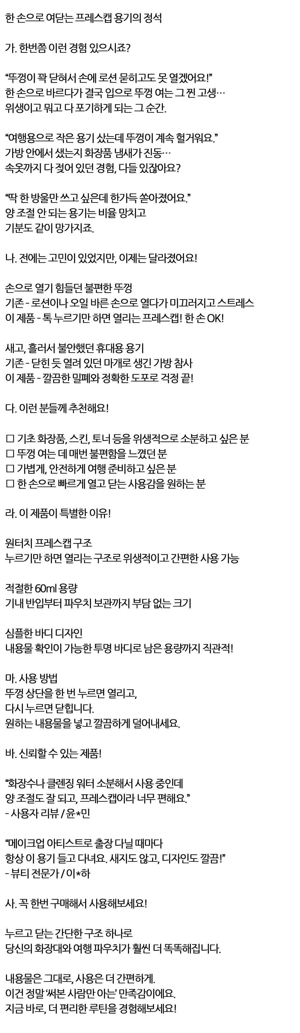간편하게 쏙 한 손으로 여닫는 프레스캡 용기 60ml