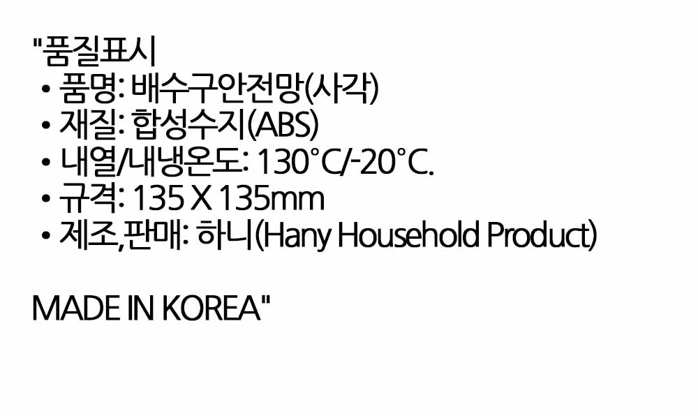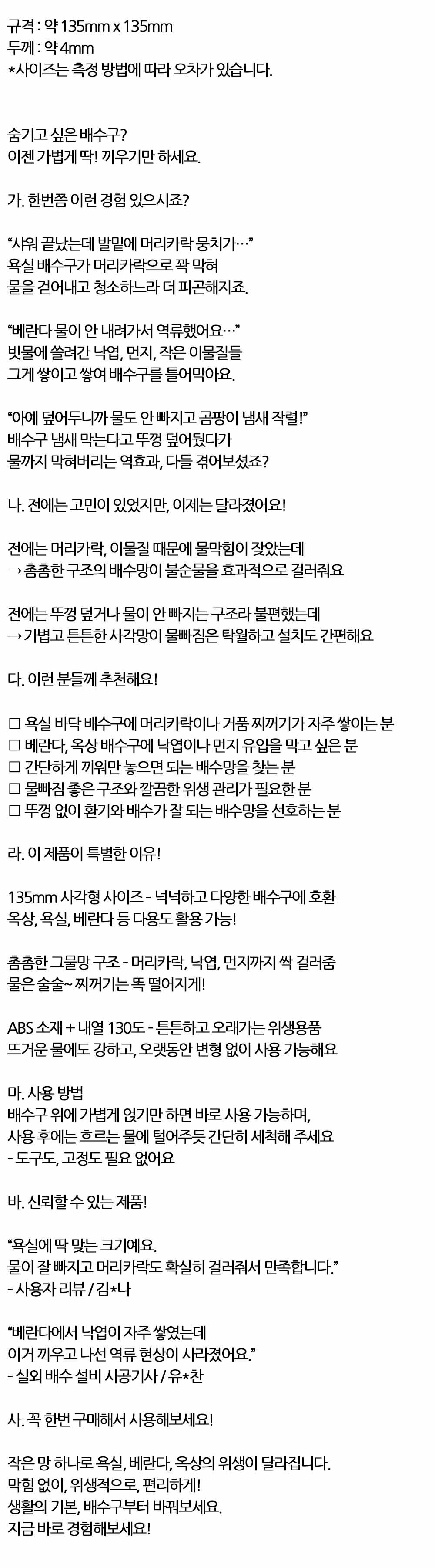 머리카락도 확실히 걸러줘요 사각 배수구안전망 135mm