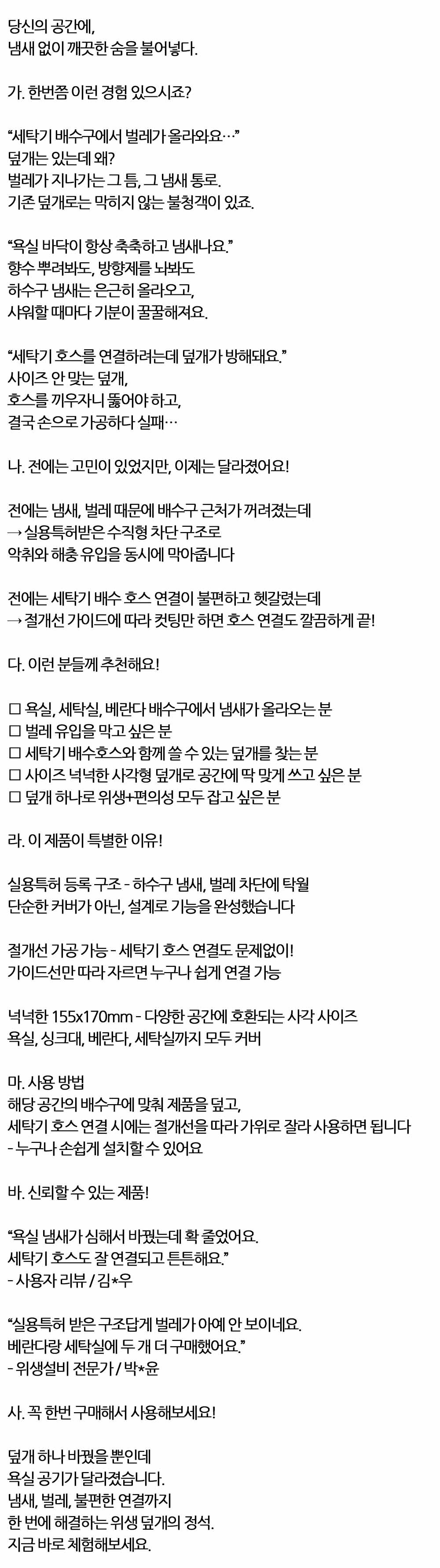 악취와 해충 유입을 동시에 막아줍니다 배수구덮개 대