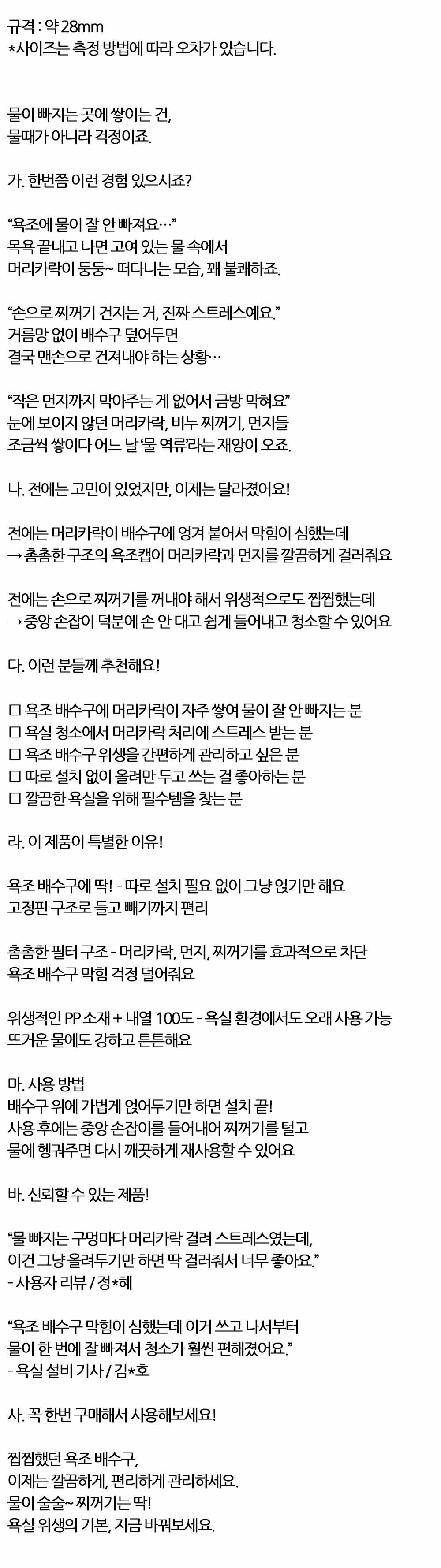 설치 필요없이 얹기만 욕조안 머리카락 찌꺼기 걸름망