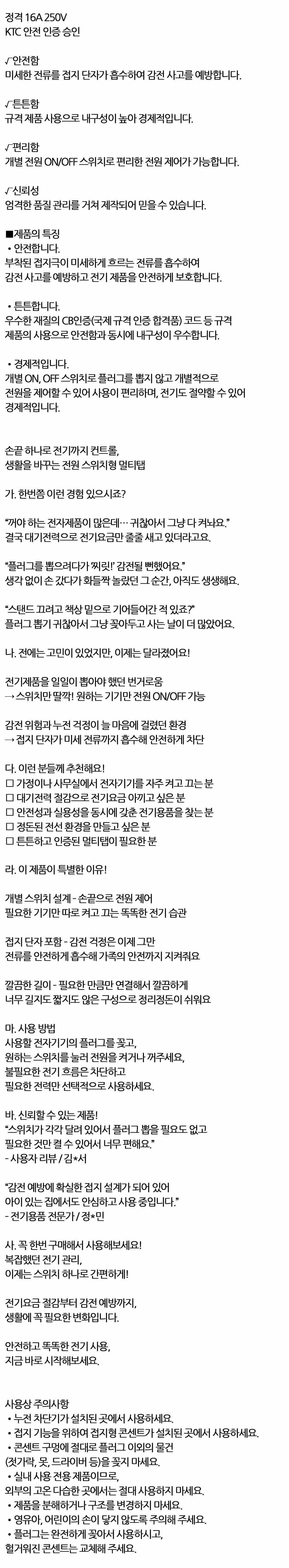전기요금 절감 감전 예방 개별스위치 멀티탭 3구 1.5m