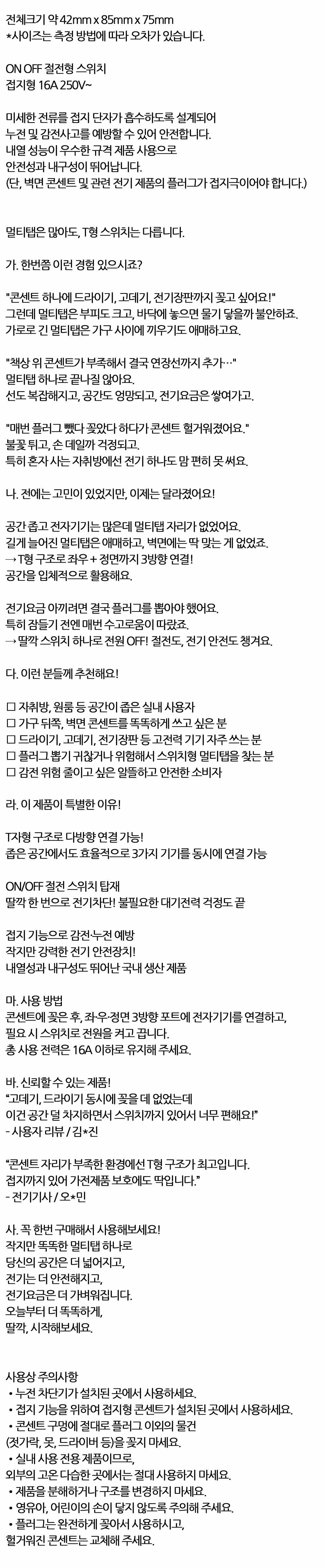 자취방 원룸 공간이 좁은 실내 T형 스위치 3구 멀티탭