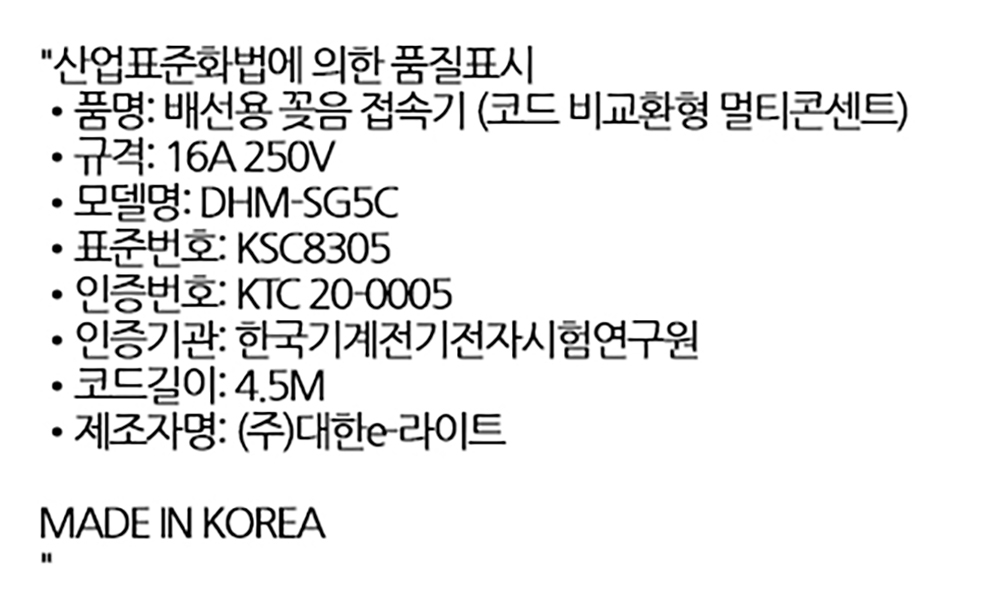 대기전력 차단 과열방지 개별스위치 멀티탭 5구 4.5M