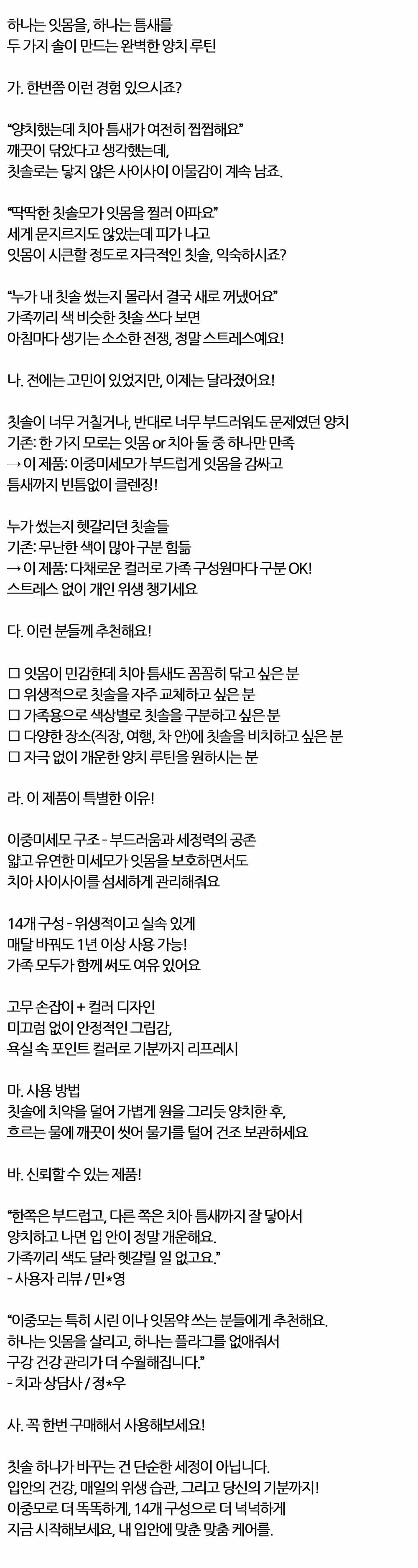 두 가지 솔이 만드는 양치 루틴 이중미세모 칫솔 14입