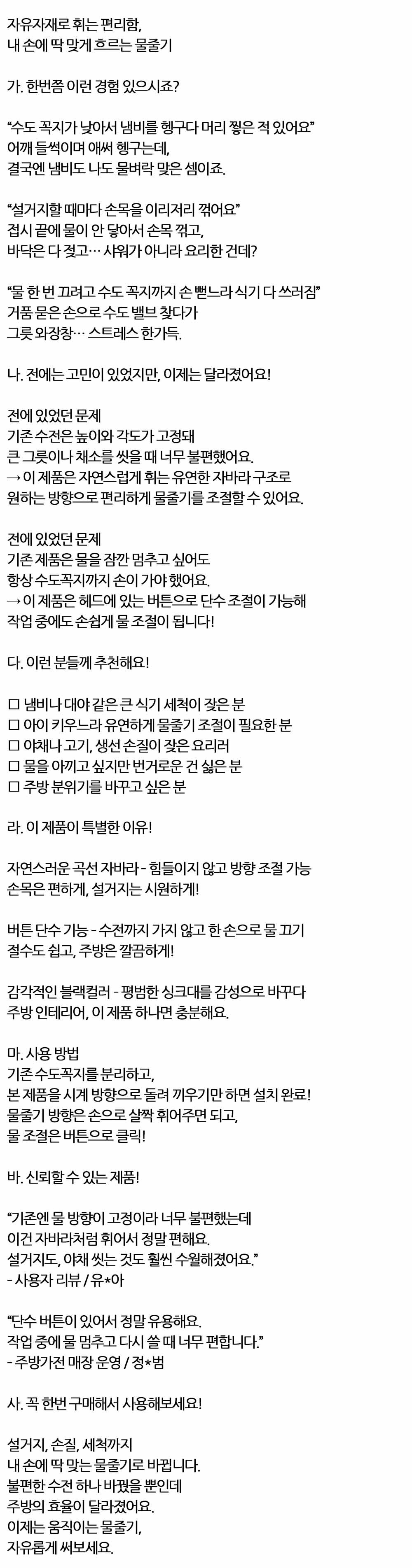원하는방향으로 편리하게 물줄기조절 주방수전 자바라