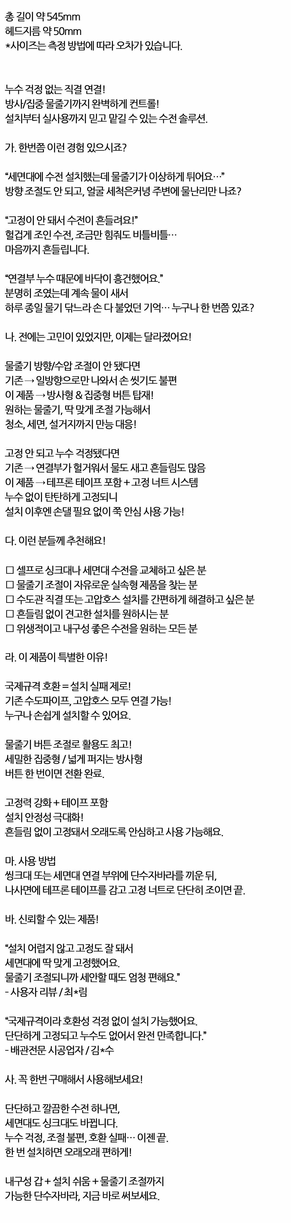 누수 걱정없는 직결 연결 주방수전 단수자바라 일자형