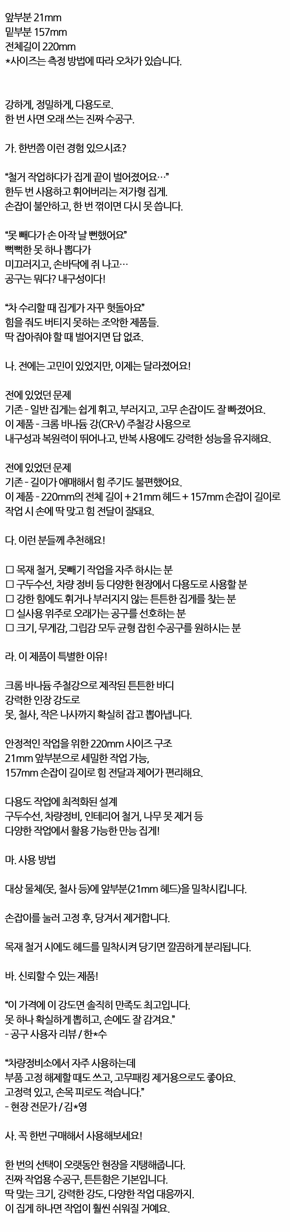 구두수선 목재철거 못빼기작업 작업공구 옥집게 220mm